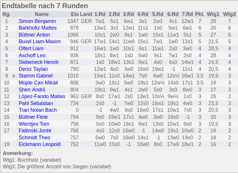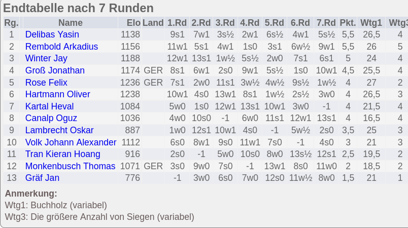 In der U10 kamen Nolan Tran und Tom Wientjes auf je 2,5 und Leopold Eickmann auf 2 Punkte (aus 7).