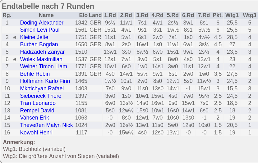 In der U16 lief es bei Nikita Kalinichenko nicht wie gewohnt, bei starker Konkurrenz kam er auf 2 Punkte aus 7 Runden.