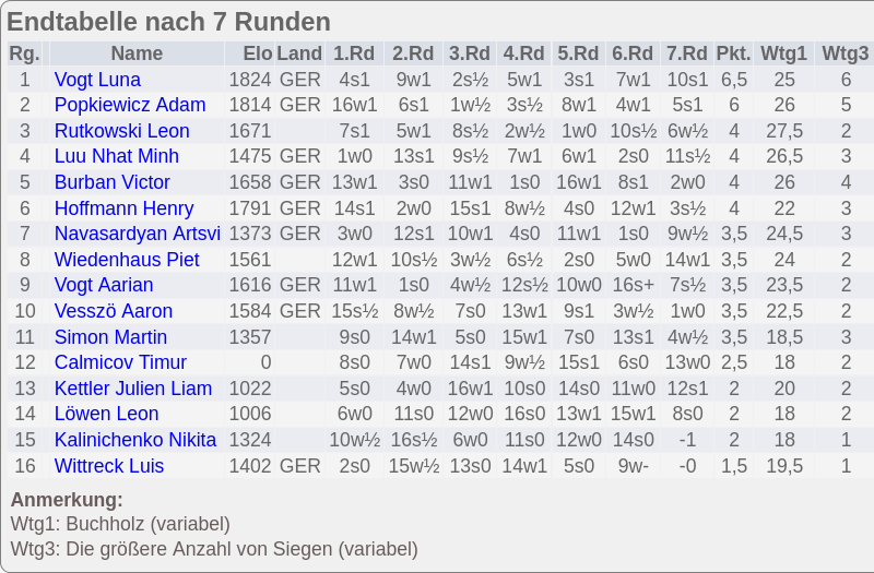 In der U10 kamen Nolan Tran und Tom Wientjes auf je 2,5 und Leopold Eickmann auf 2 Punkte (aus 7).